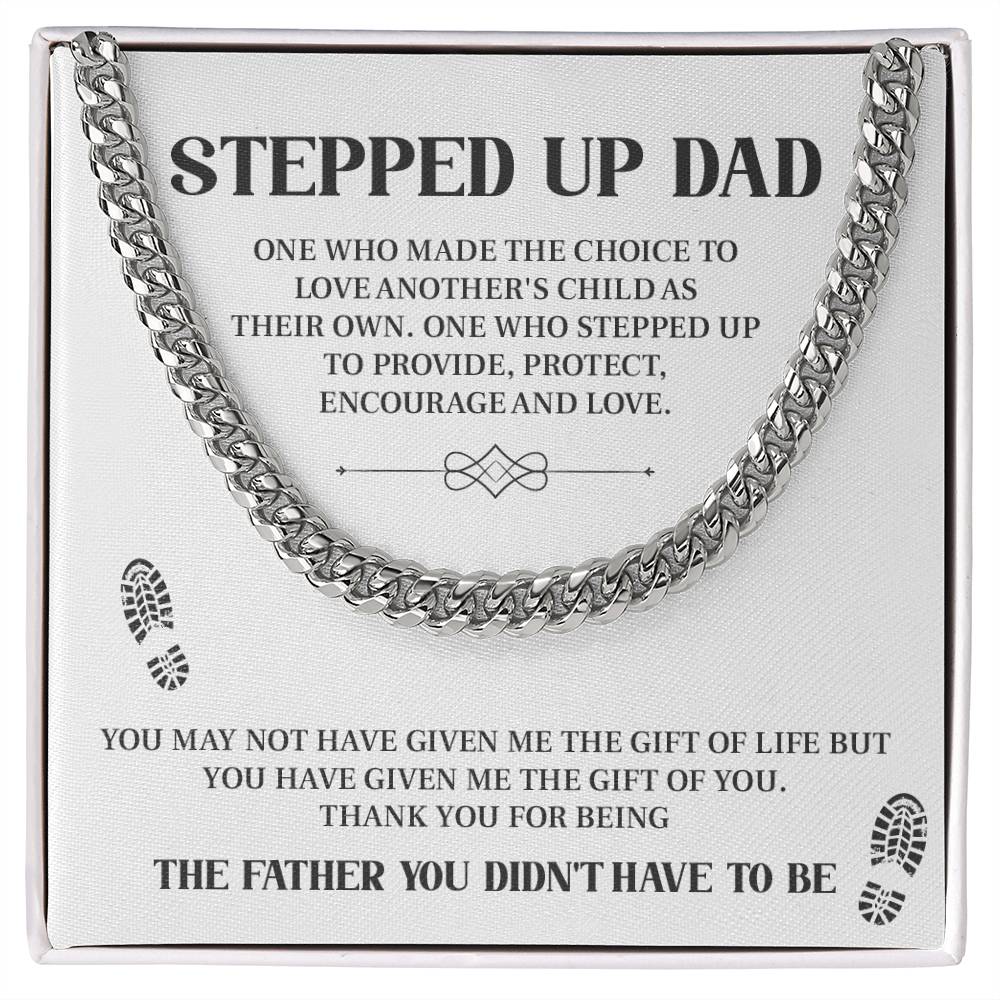 Appreciate the man that decided to love, protect and guide like a real father with this powerful Cuban chain necklace. With a heartwarming message card that is devoted to the Stepped Up Dads, this is the best greeting to say thank you to the man who did not have to be but who decided to be.