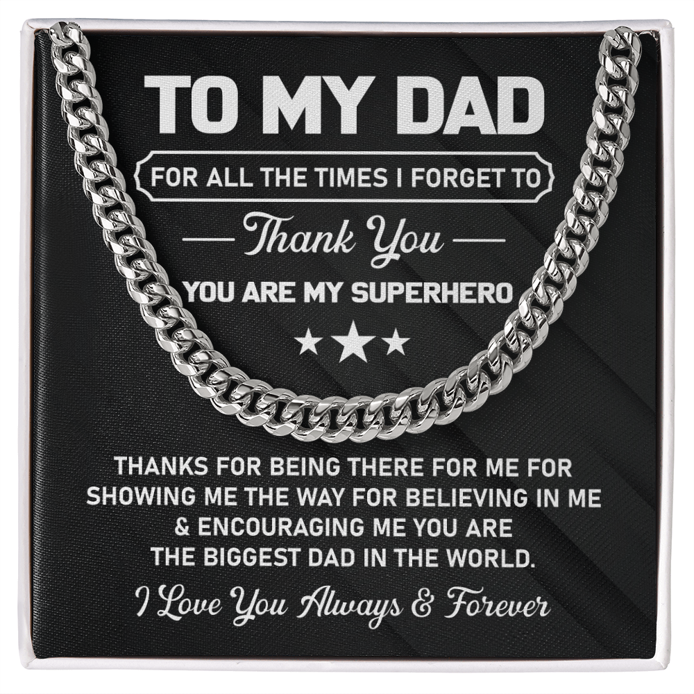 Show your love for Dad through this powerful stainless steel chain design inspired by Cuban style. The gift combines a keepsake message honoring his enduring strength which makes it an excellent choice to show him his superhero status.