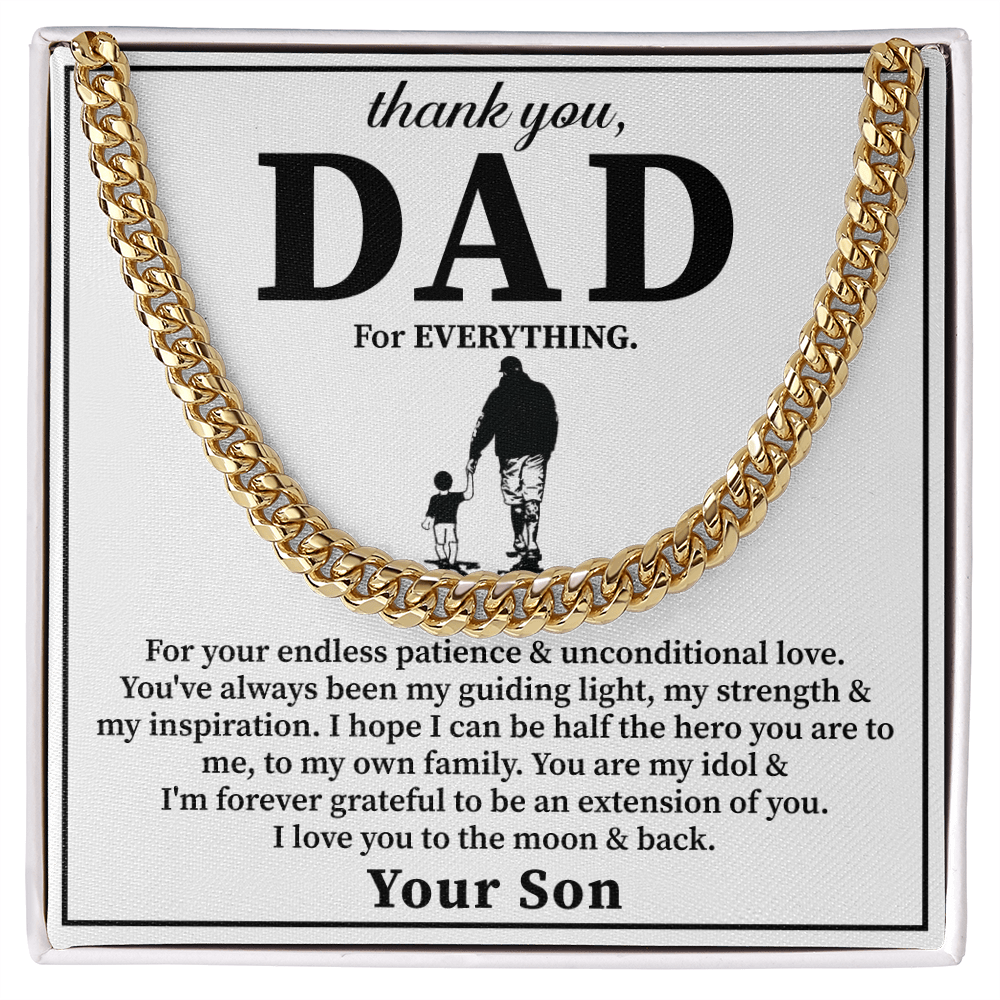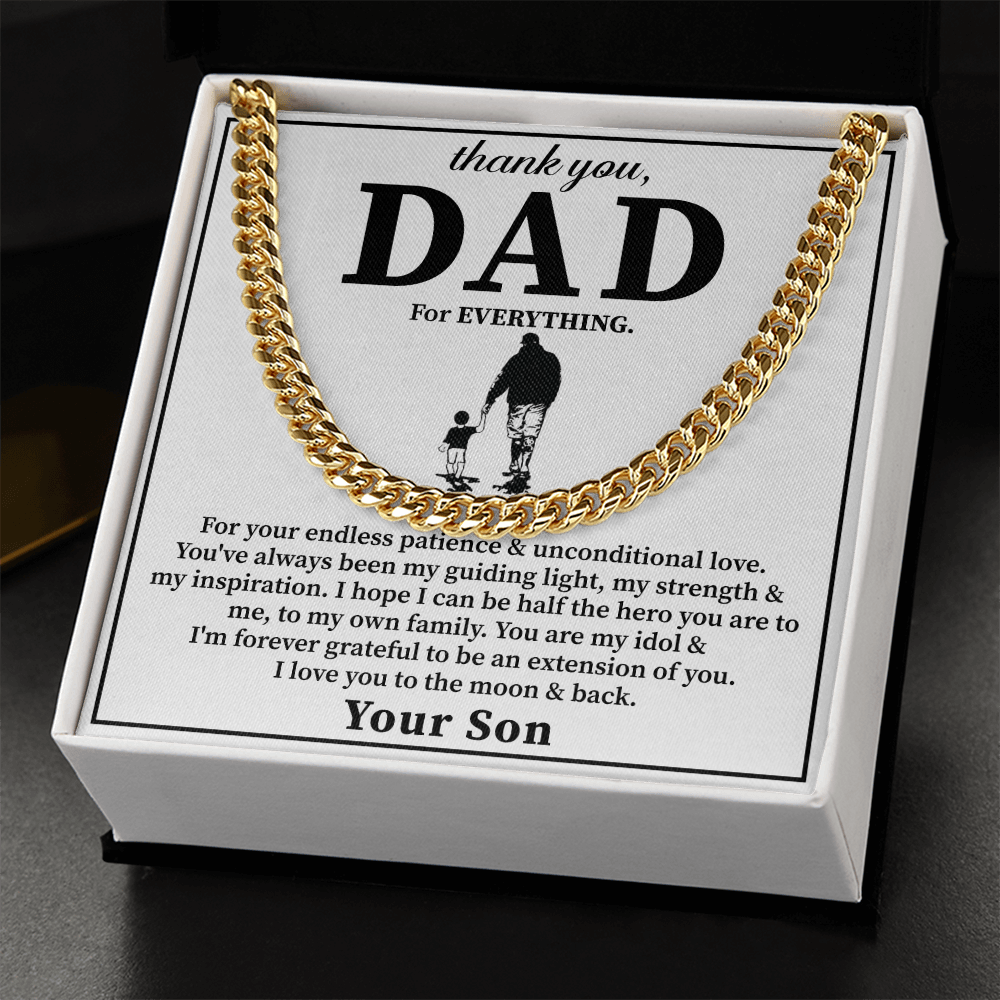 A powerful gift expressing your strong bond should honor your father. The stainless steel Cuban Chain Necklace serves as a powerful yet sentimental gift which a son gives to his father while featuring a meaningful message card that captures feelings beyond words.
