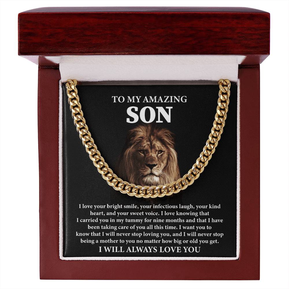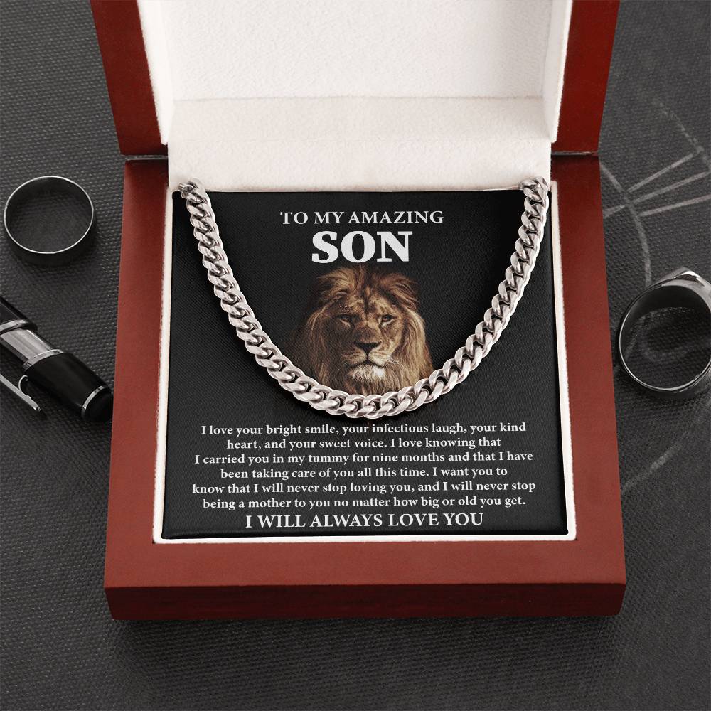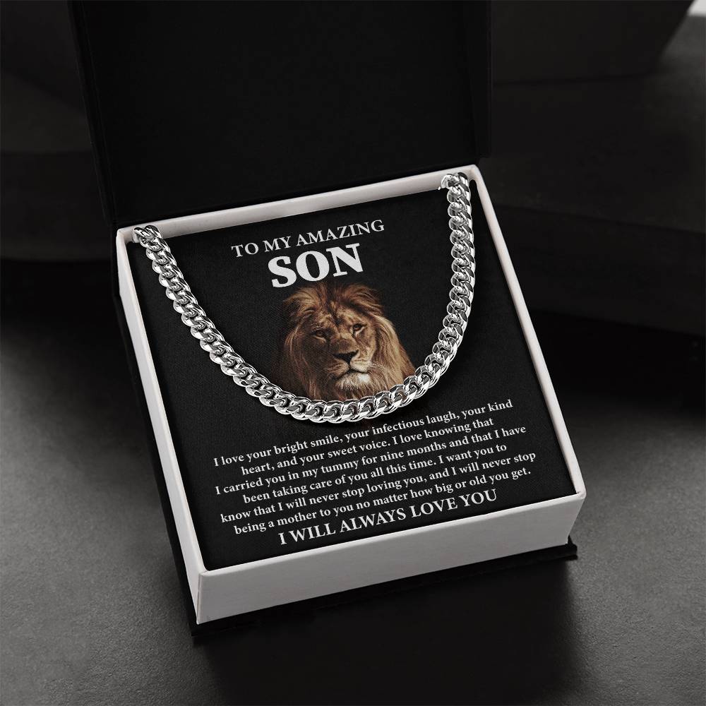Demonstrate to your son how much your love is unconditional with this strong Cuban chain necklace and emotional lion-themed message card. He can be either in the process of becoming a man or already be a big man, and this will be the best gift on his birthday, milestone or just to remind him of the connection between you.