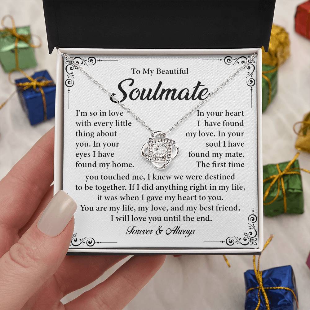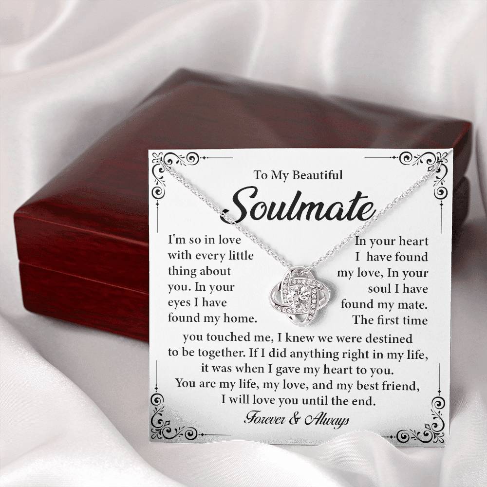 A romantic love knot necklace with the words on it will surprise your soulmate. With a daring message card that guarantees love in this world and the next, this necklace is the ideal one to give to a person seeking Valentine day gifts, anniversary jewelry to wife, or highly emotional gifts to girlfriend or fiancee. It is the best soulmate gift a woman can receive with a fancy gift box and strong words of love.