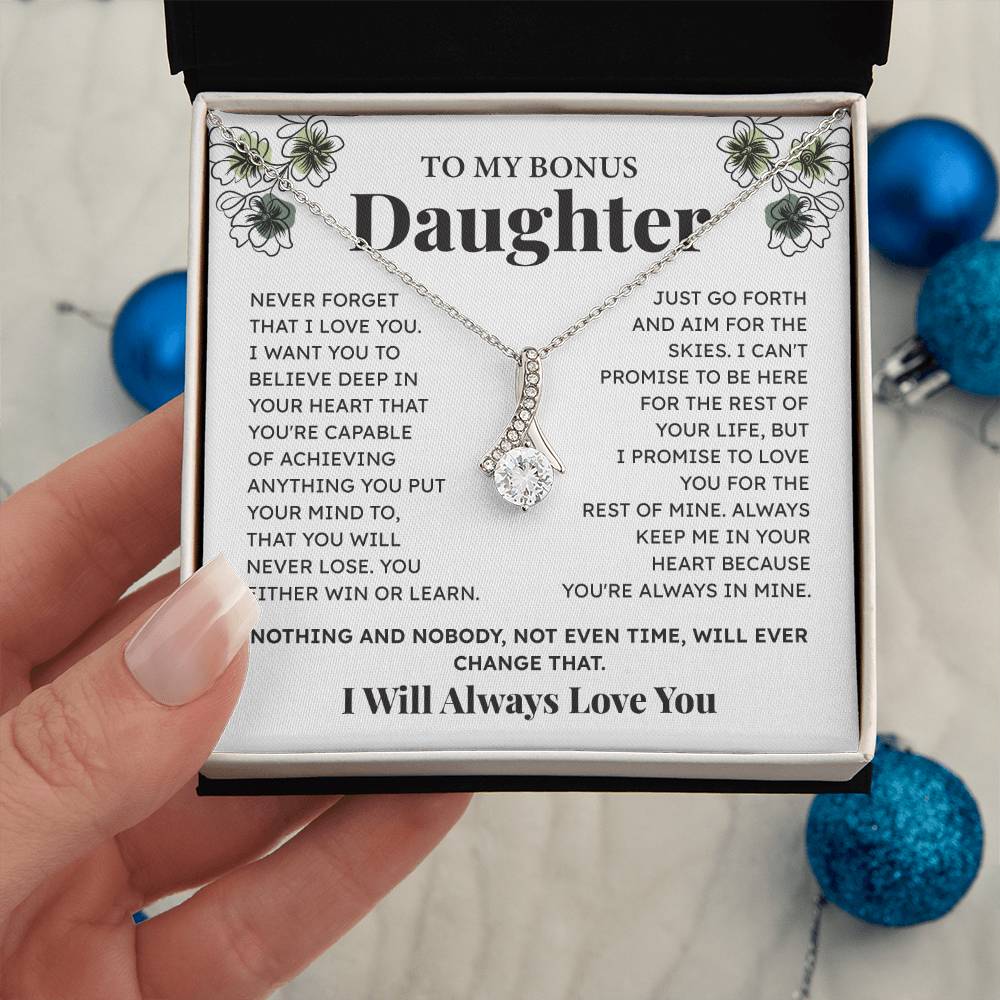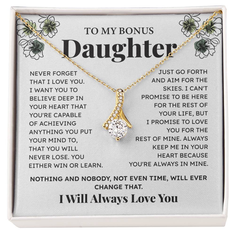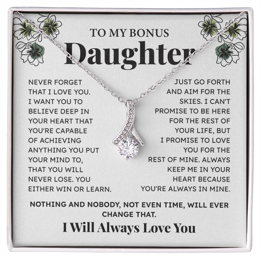 Mark your relationship with your bonus daughter with this beautiful necklace and motivational message card. A valuable present that will remind her how she is loved and supported. Ideal as a birthday gift, graduation gift or any gift.