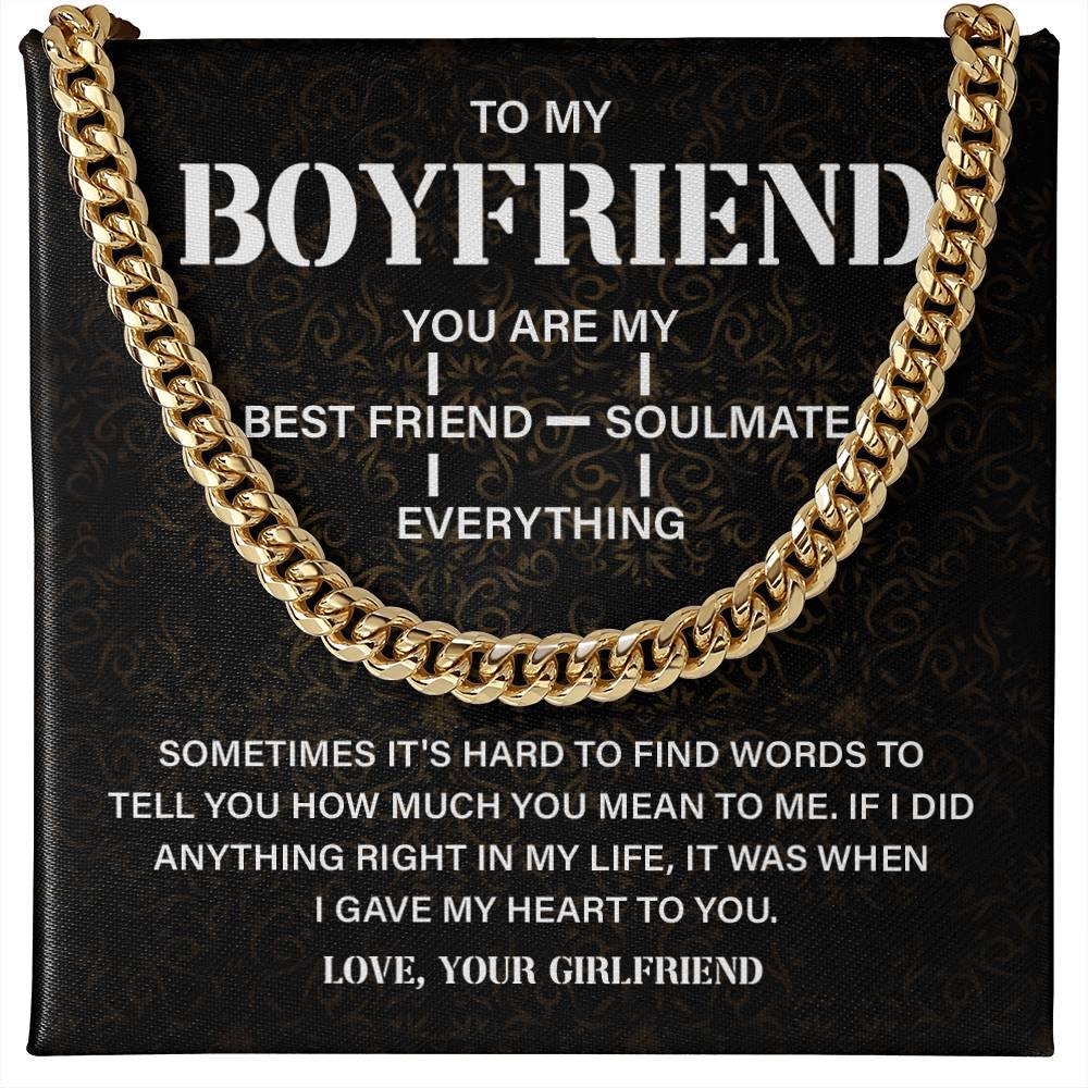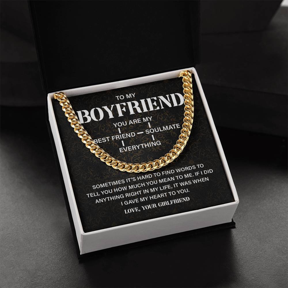 Buy your boyfriend a present he will never forget using this Cuban chain and message card set. It is a great means of expressing your love and telling him that he is not your boyfriend, but your soul mate, best friend, and more.