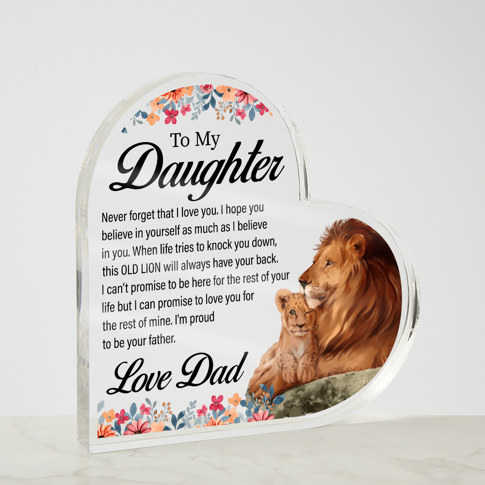 Commemorate the love between a loving father and his beloved daughter with this powerful lion-shaped heart-shaped acrylic memento. A sign of unshakeable strength and passionate love, this gift will be perfect for daughters of any age.