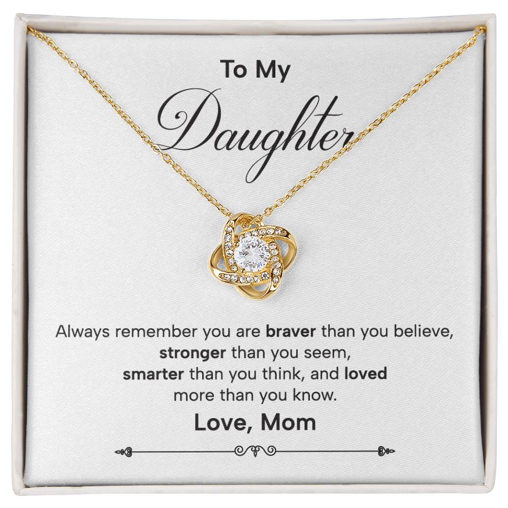 This beautiful necklace is a Love Knot that mom can use to show her daughter how strong, smart, and loved she is. This beautiful piece of jewelry is accompanied by an empowering message card, and it is ideal to give her on her birthday, graduation, Christmas, or whenever you want to make her feel good and remind her how much you love her unconditionally.