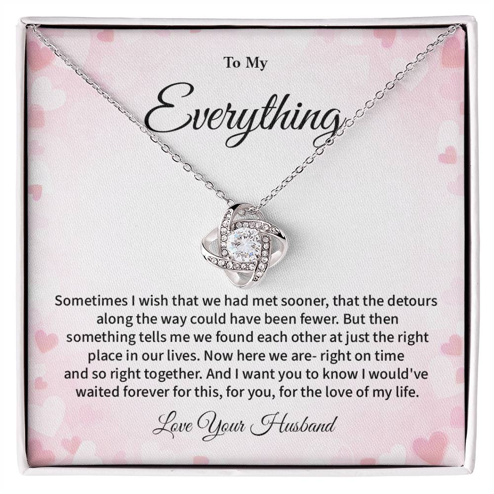 Show your wife how much you love her with this glittering necklace of Love Knot. This romantic jewelry was specifically designed to suit husbands, with a moving message card labeled as To My Everything, which takes the real essence of your love. A thoughtful present to mark anniversaries, birthdays, Valentine Day or out of the blue.