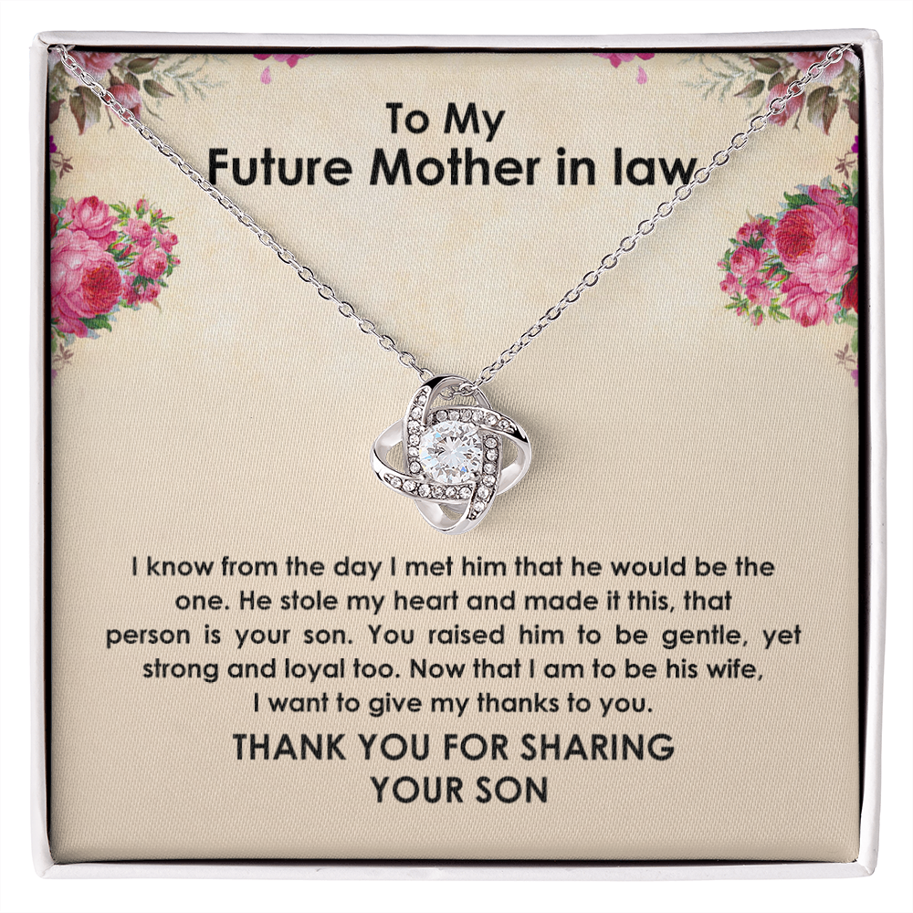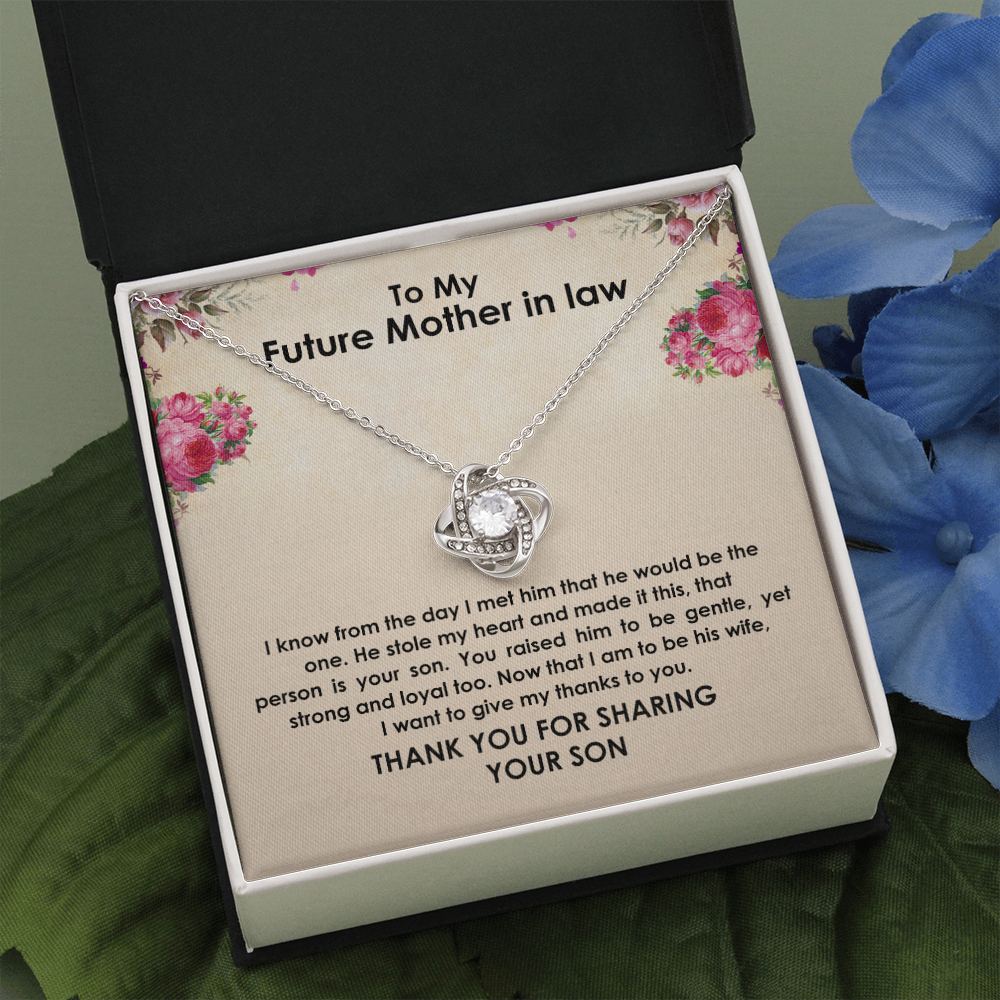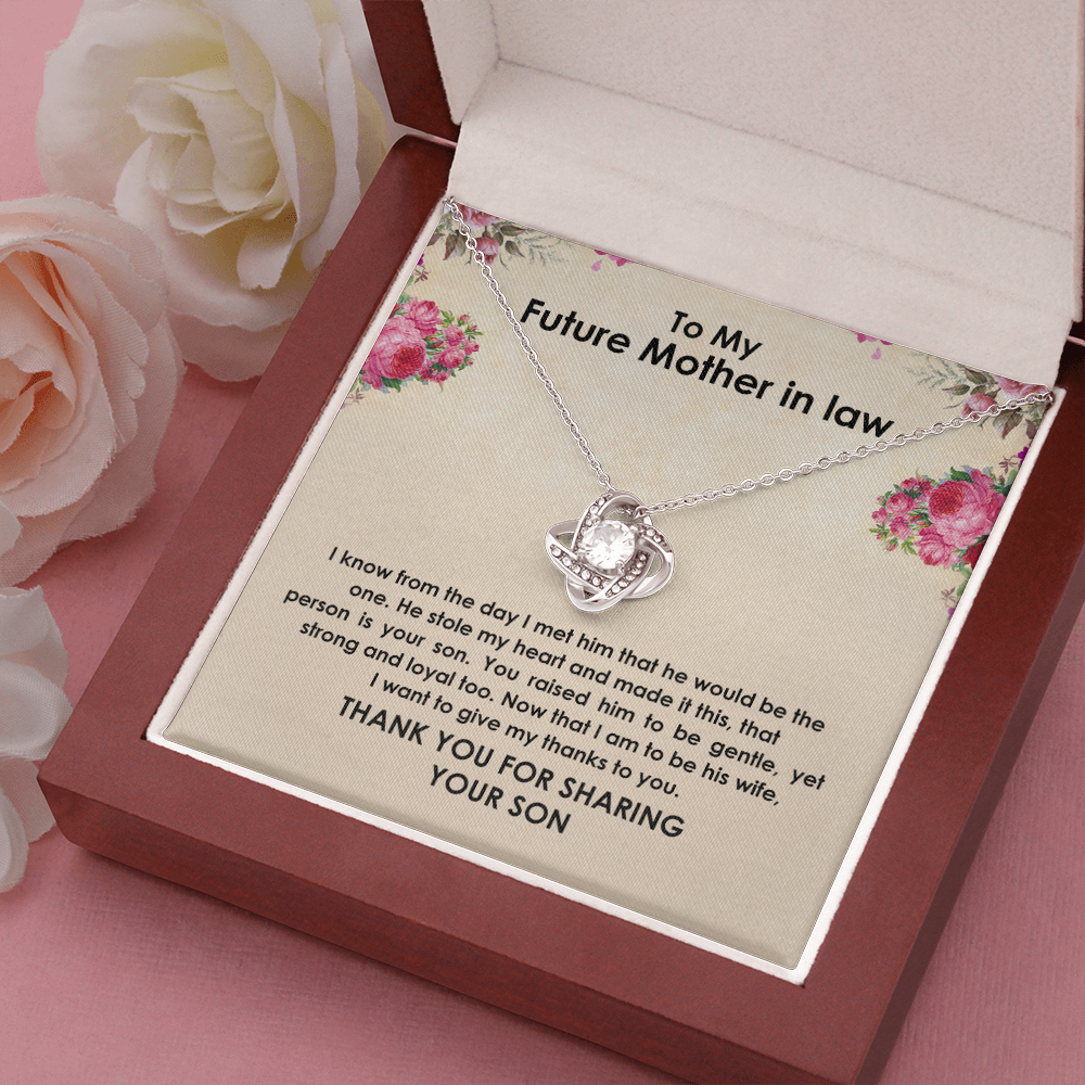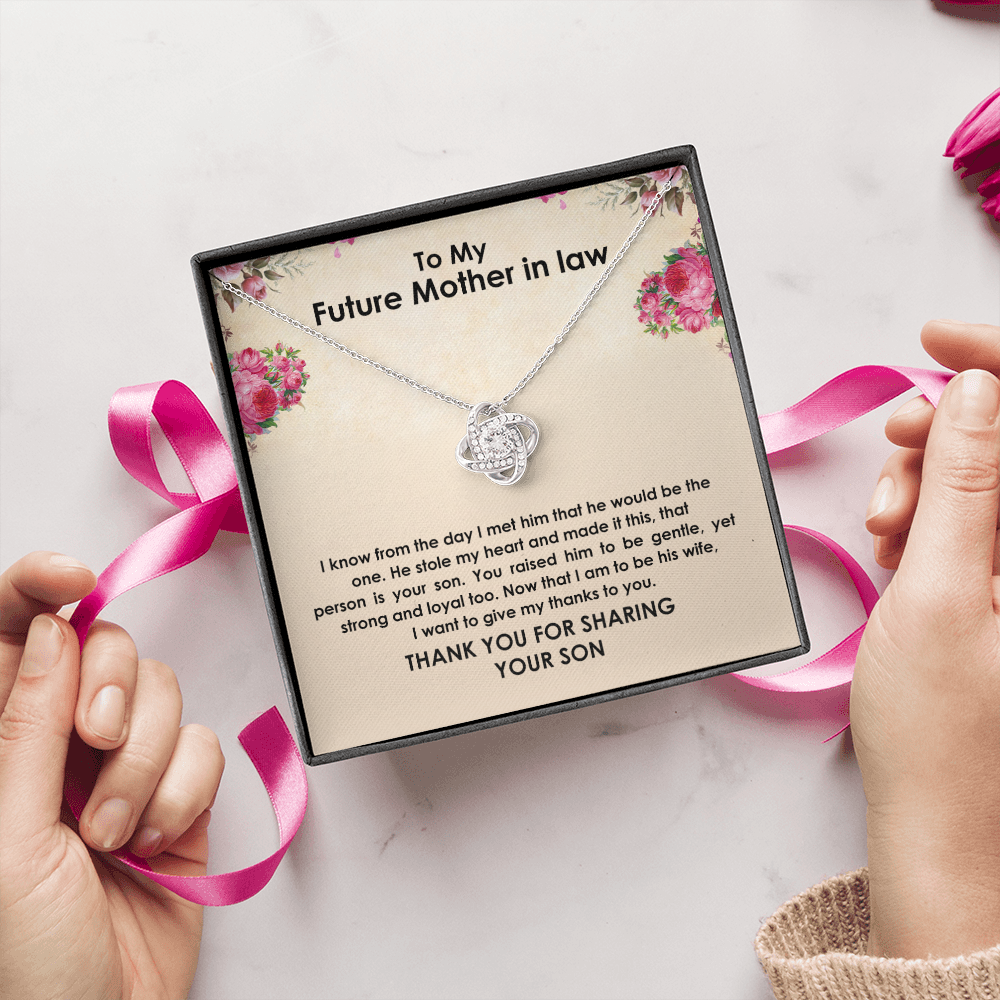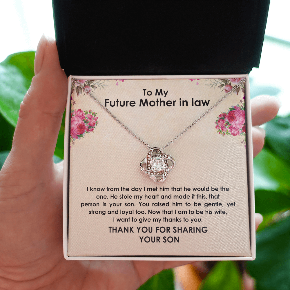 You can express gratitude to your future mother-in-law through this refined necklace combined with a meaningful message card. This heartfelt message shows appreciation for both caring for the man you love and accepting the person who will become your son. The message reads: