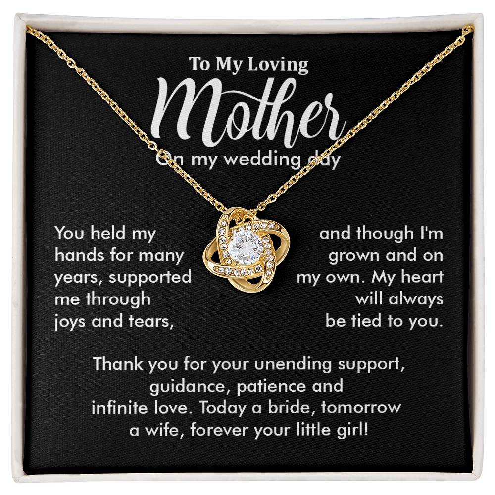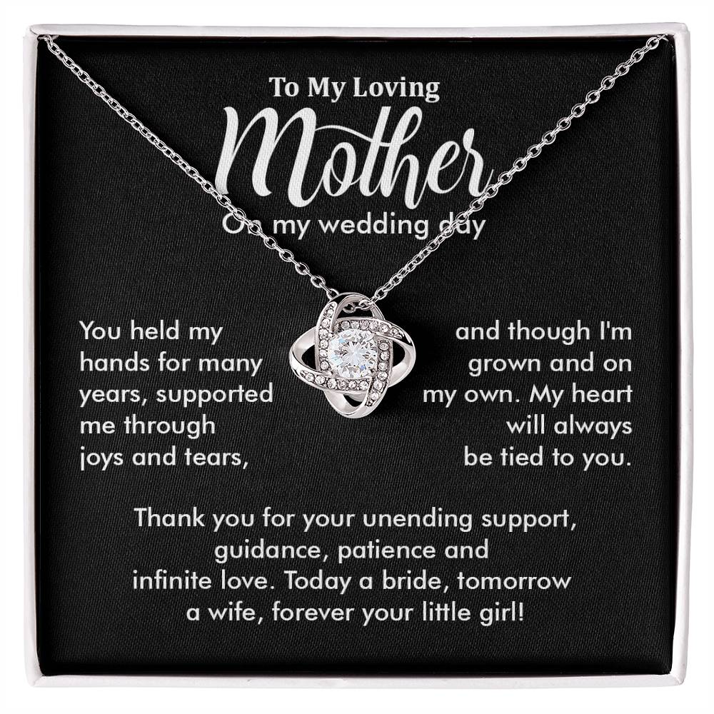 Show your love for your mom with a meaningful gift on your wedding day. This beautiful knot pendant necklace is a perfect gift for mothers from their daughters on Mother’s Day. The bond you’ll have with her is beautifully captured in a touching message card, so it’s a wonderful mother of the bride gift.