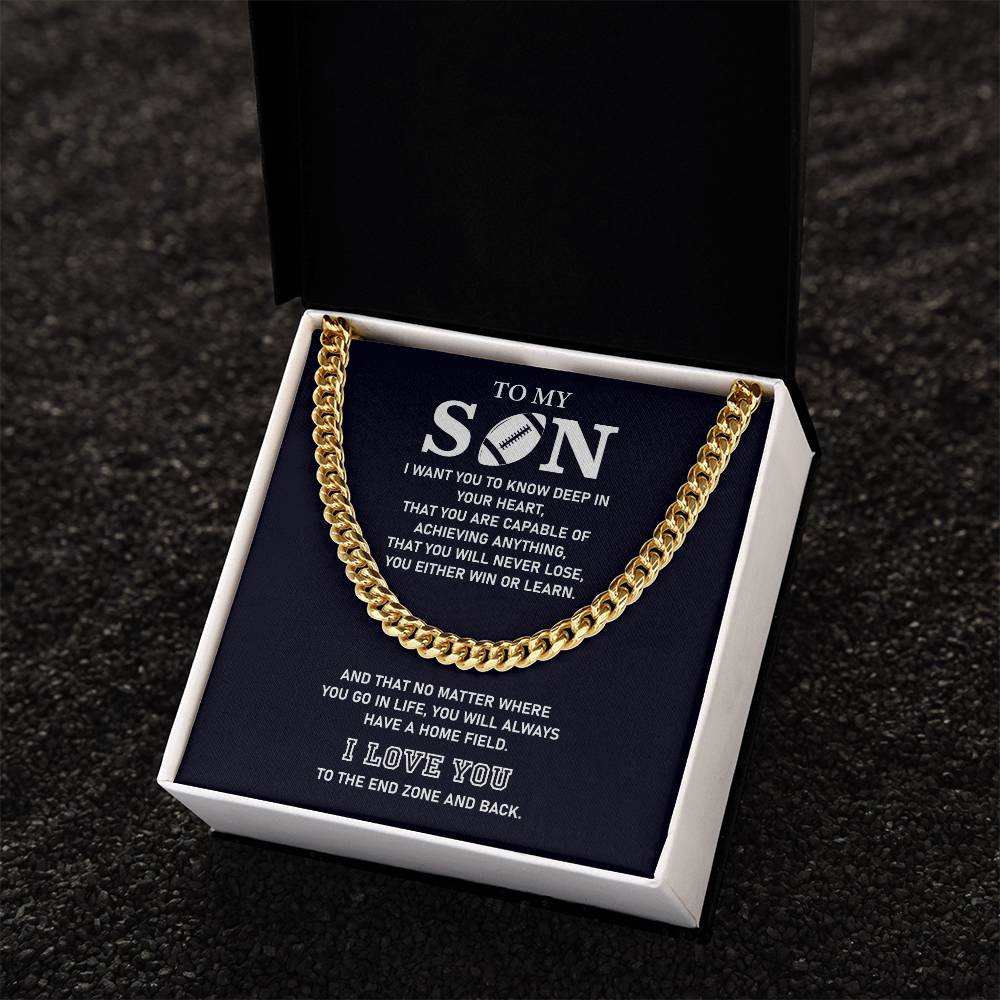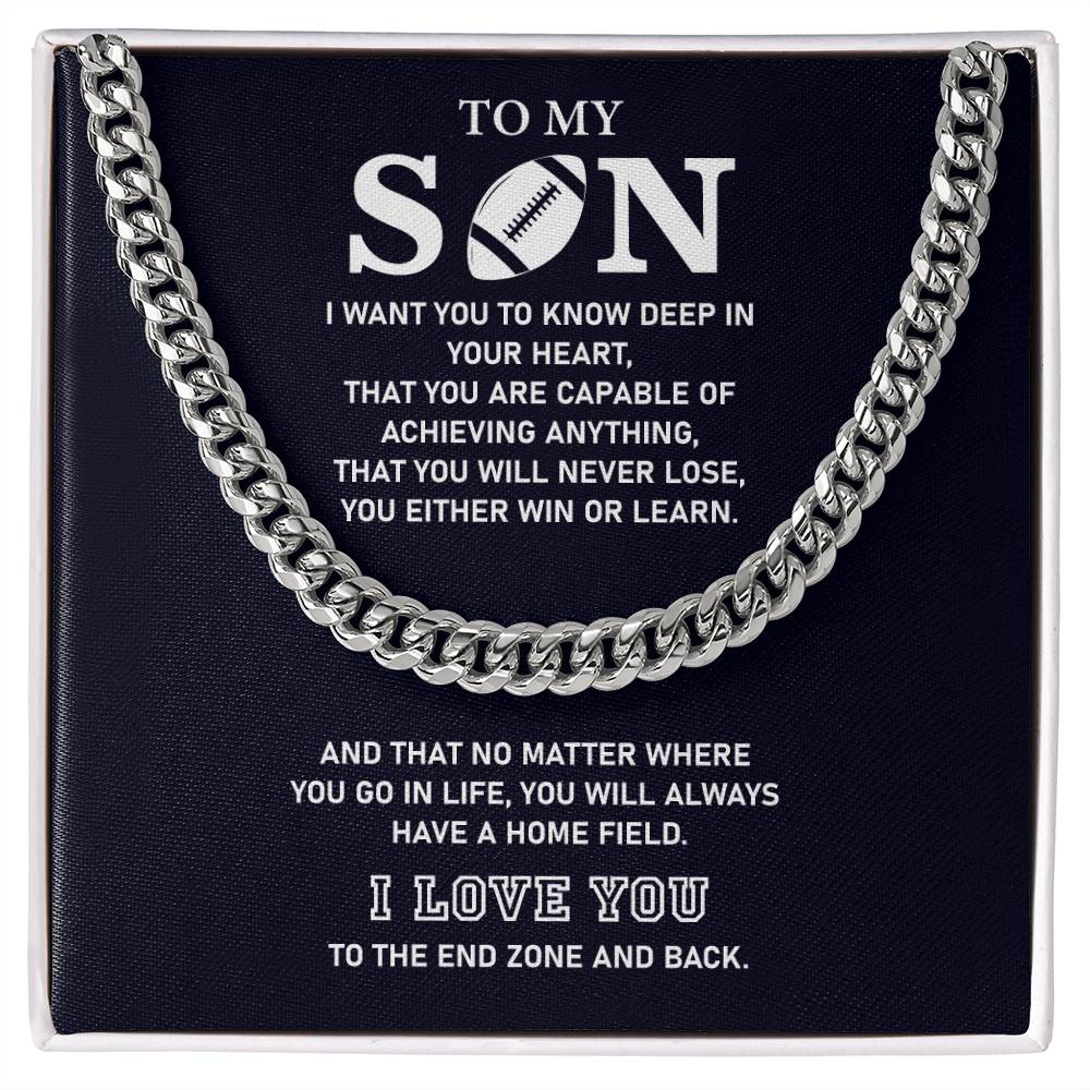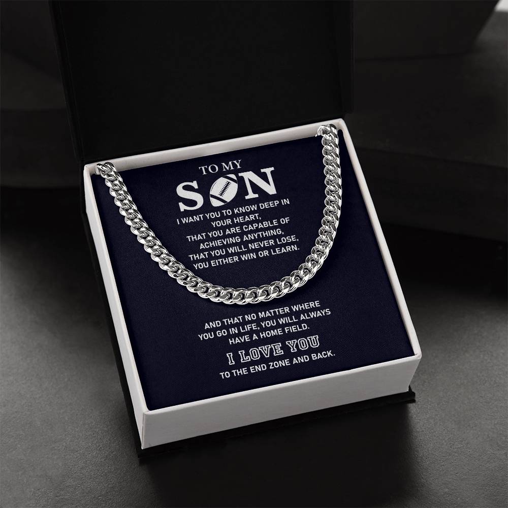 Share your son love of football and life with this bold Cuban link chain necklace. With a strong sports-themed message card, this gift is ideal to give on birthdays, graduations or inspirational times to remind him that you have confidence in him.