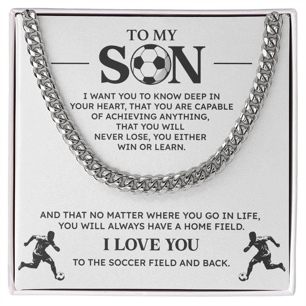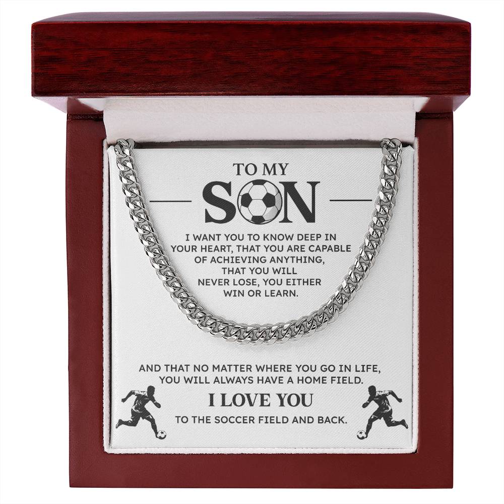 Reward your son with this daring Cuban chain necklace to show your appreciation of his commitment and enthusiasm to soccer. This gift will include a motivational message card with a message that is specific to young athletes because it reminds him that he can achieve great things both on and off the field. Ideal as a birthday gift, a team victory or just because.