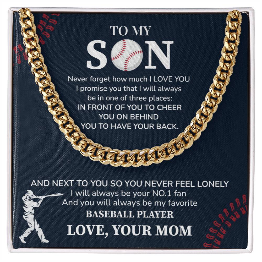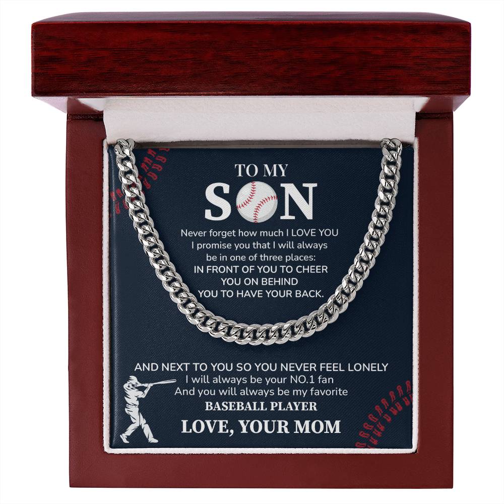 This Cuban chain necklace is a great way to celebrate the love you have your son and his passion of baseball. The message card inserted in this keepsake has a heart-touching sports-themed message card that is sent by Mom and it is the best gift to give to your favorite baseball player. Perfect as a birthday present, a team win gift or just because.