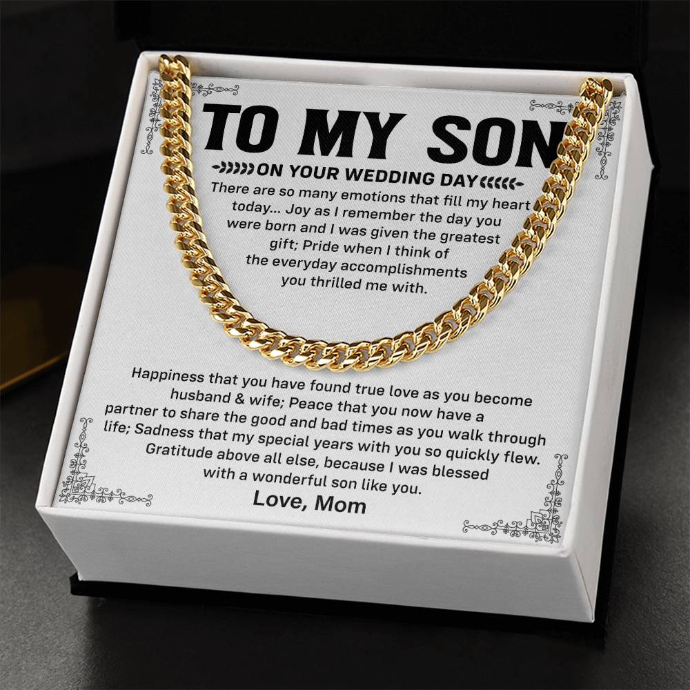 Give your son a present that he will remember all his life as one of the most important moments in his life. This is an impressive Cuban chain necklace that makes a heartfelt wedding day gift from Mom to Son, complete with a touching message and pretty packaging that celebrates your relationship and indicates his new life as a husband.