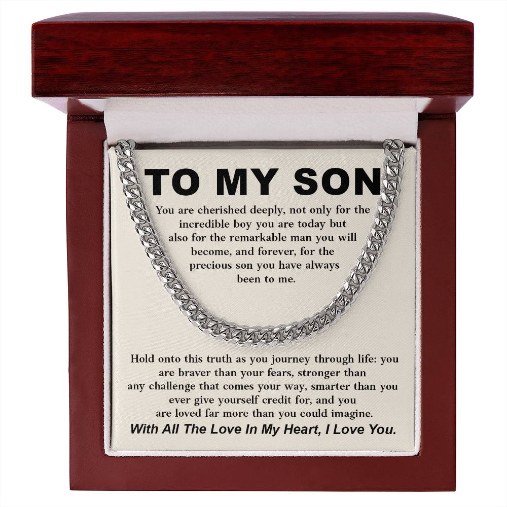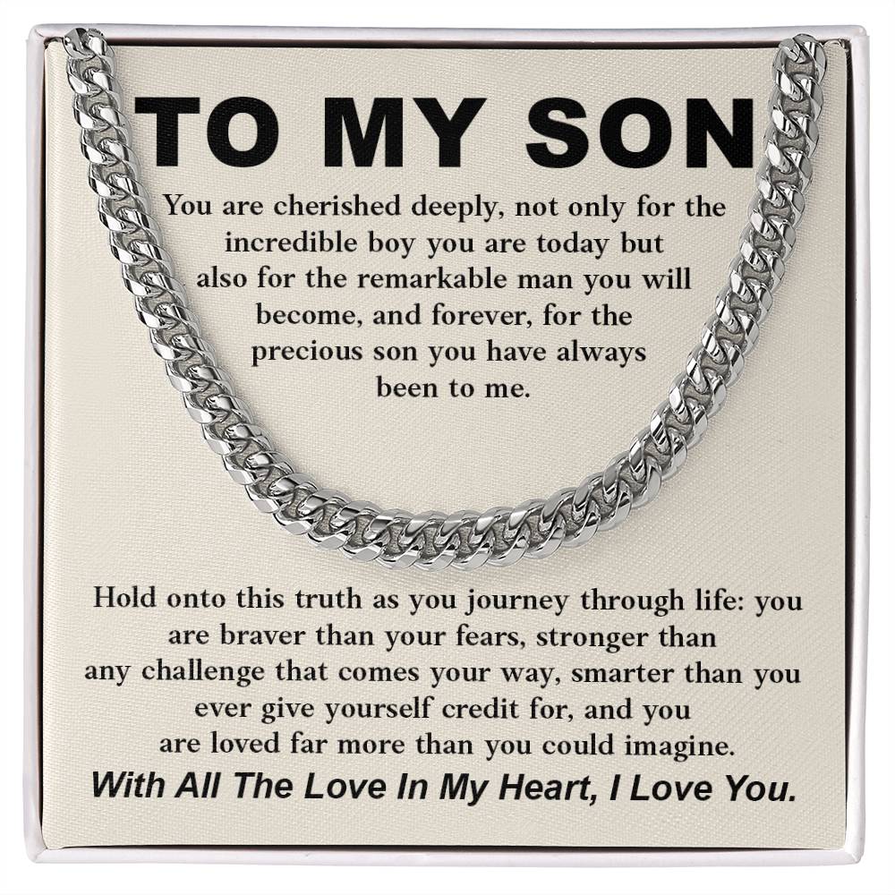 Mark his growth and strength with this Cuban chain necklace which shows your son how much you love and appreciate him. A heartfelt message card accompanies this classic piece.