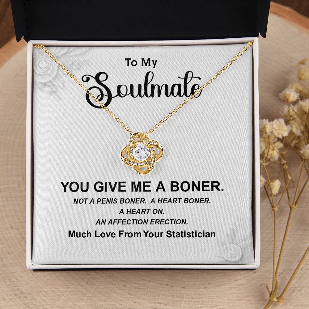 Tell your numbers-loving soulmate that she is the only variable in your equation with this funny and cute Love Knot necklace. It comes with a witty message card courtesy of a dedicated statistician, so it is the ideal combination of funny and warm-fuzzy-ness, and can be given on Valentine Day, an anniversary, or just because.
