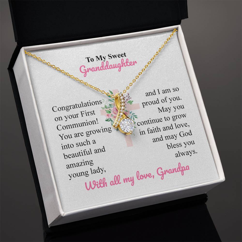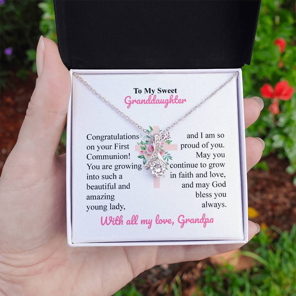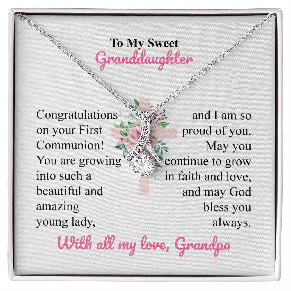 Mark your granddaughter First Communion by giving her a special gift that she will always remember. This fancy necklace is accompanied by a heartwarming message card sent by Grandpa, whose design is made in a floral cross pattern background- an excellent way to celebrate her special day of faith.