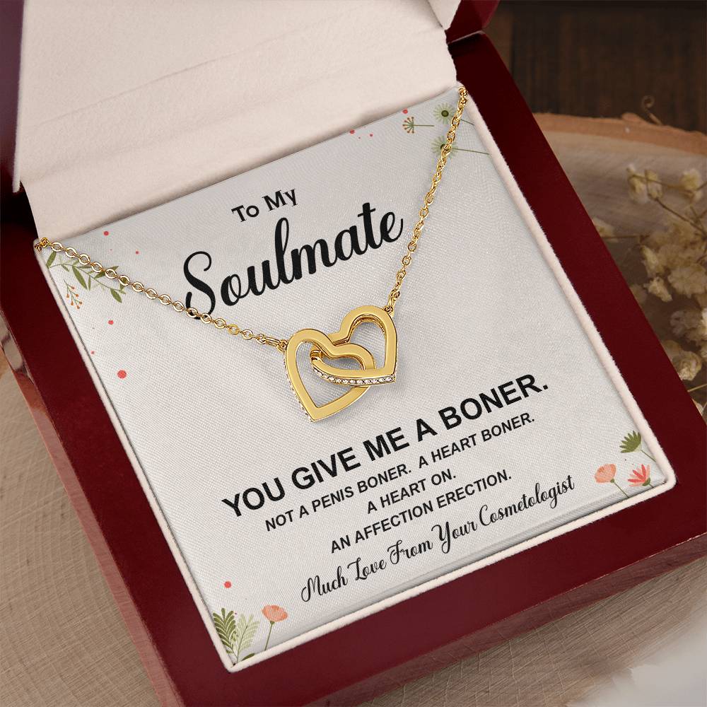 Make your partner happy with this funny-romantic gift of a cosmetologist! This is a great gift to anyone who likes beauty, humor and a touch of surprise with its interlocking hearts necklace and cheeky message card. Perfect as an anniversary gift, on Valentine Day or to say I love you with a giggle.