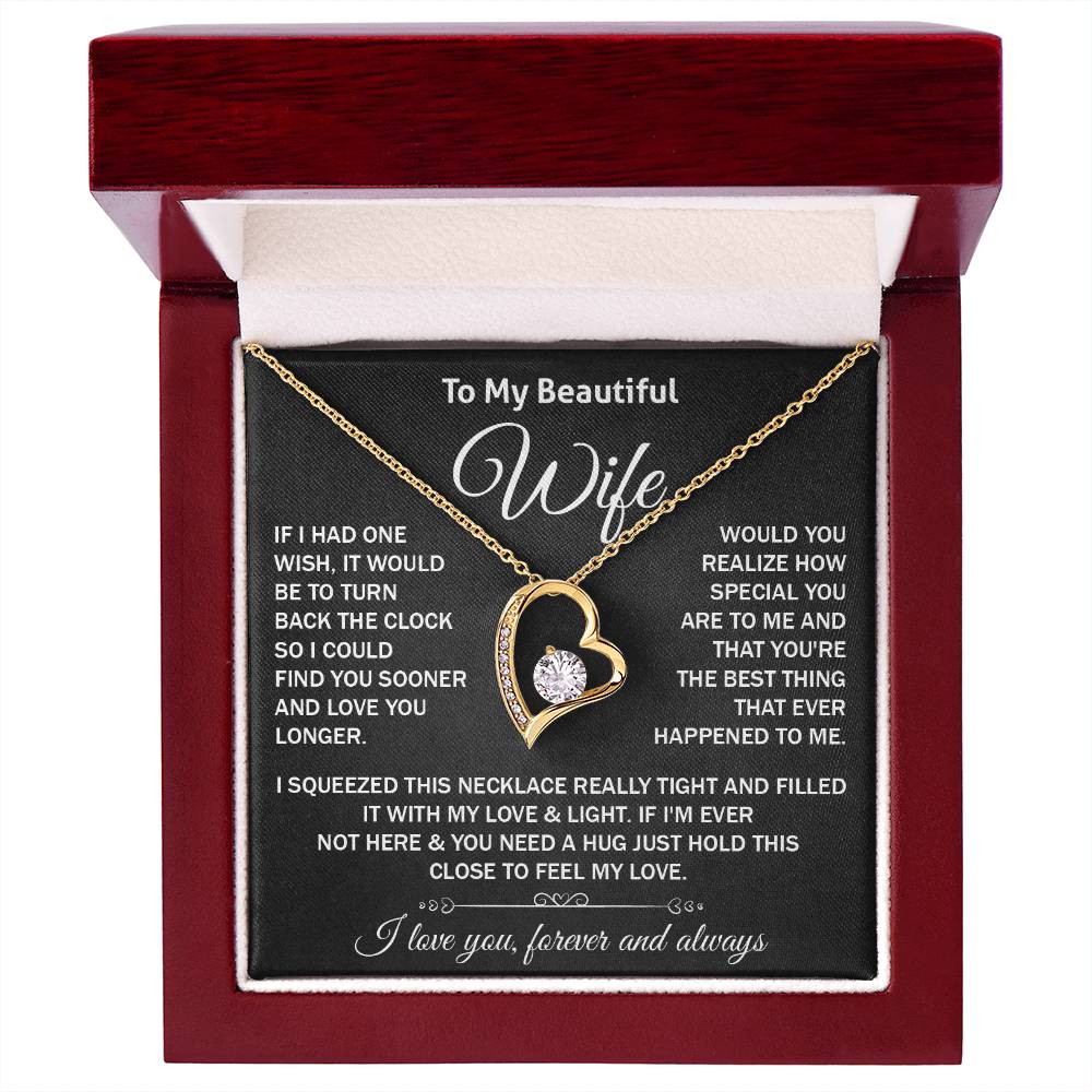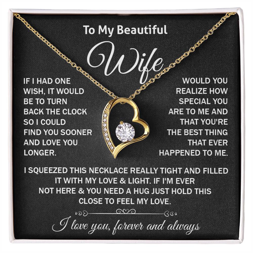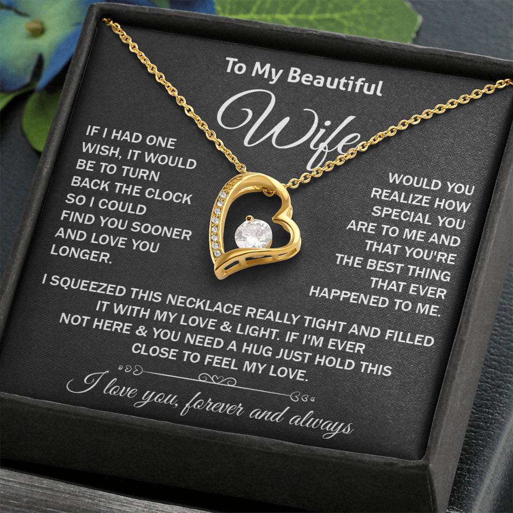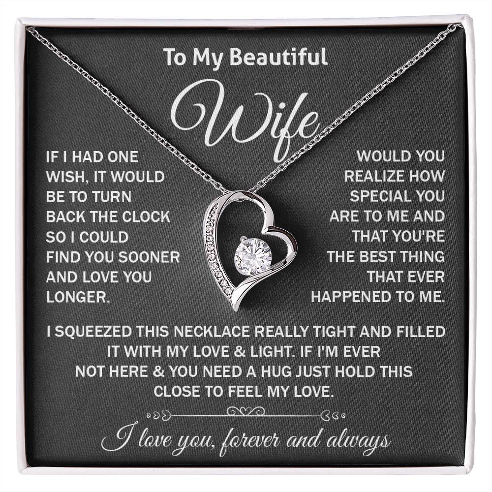 Remind your wife how much you love her with a surprise. This romantic heart-shaped necklace is just the right gift to her- with a heart-warming message card that comes straight to the heart. Perfect as a birthday present, anniversary, Valentines Day or just because.