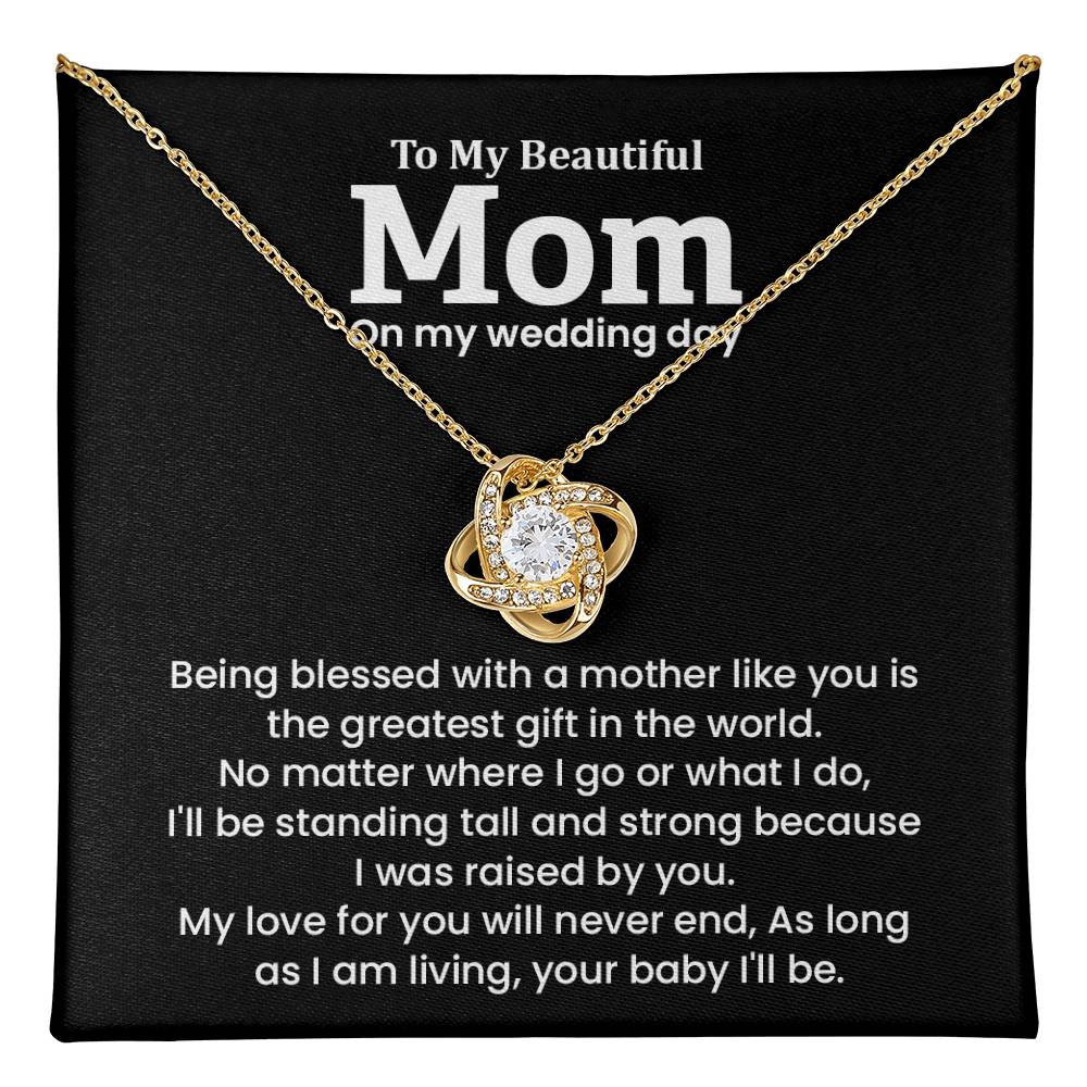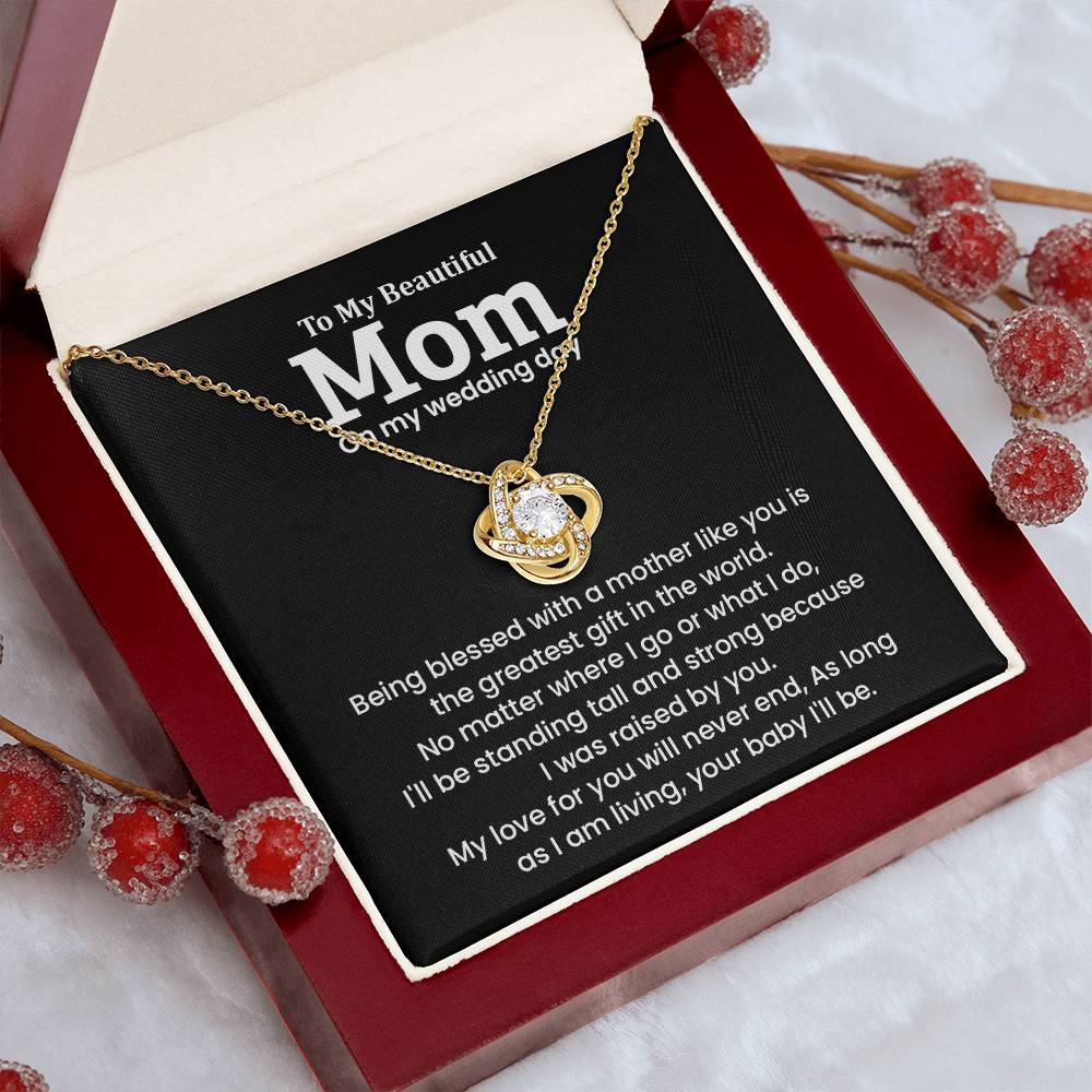 Thank your mom from the bottom of your heart on your wedding day. A bride can give her mother this beautiful knot necklace on her wedding day. This item comes with a moving message card to celebrate the love, strength and support she has always given you.