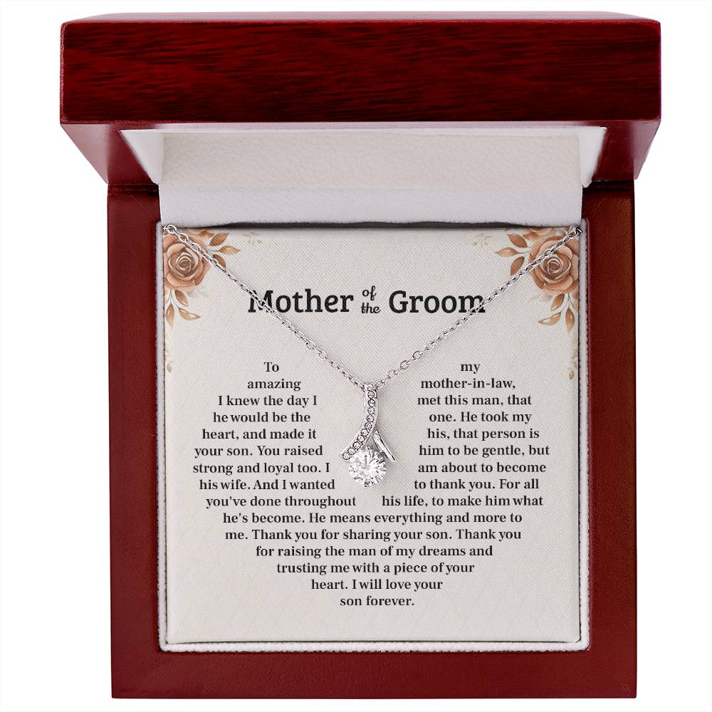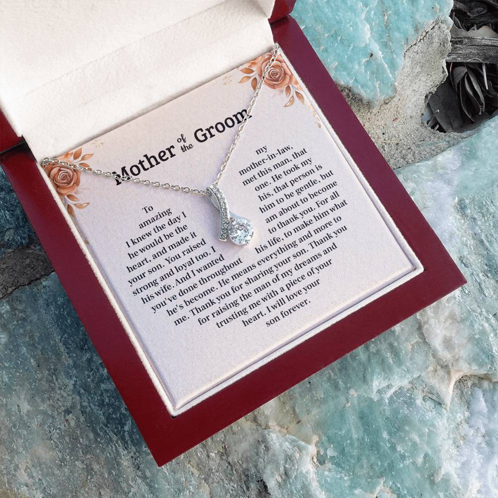 Surprise your future mother-in-law with a meaningful wedding gift that captures your gratitude. This elegant necklace with a heartfelt message is the perfect gift from bride to groom’s mom, honoring her role in raising the man you love. A keepsake she'll cherish forever.
