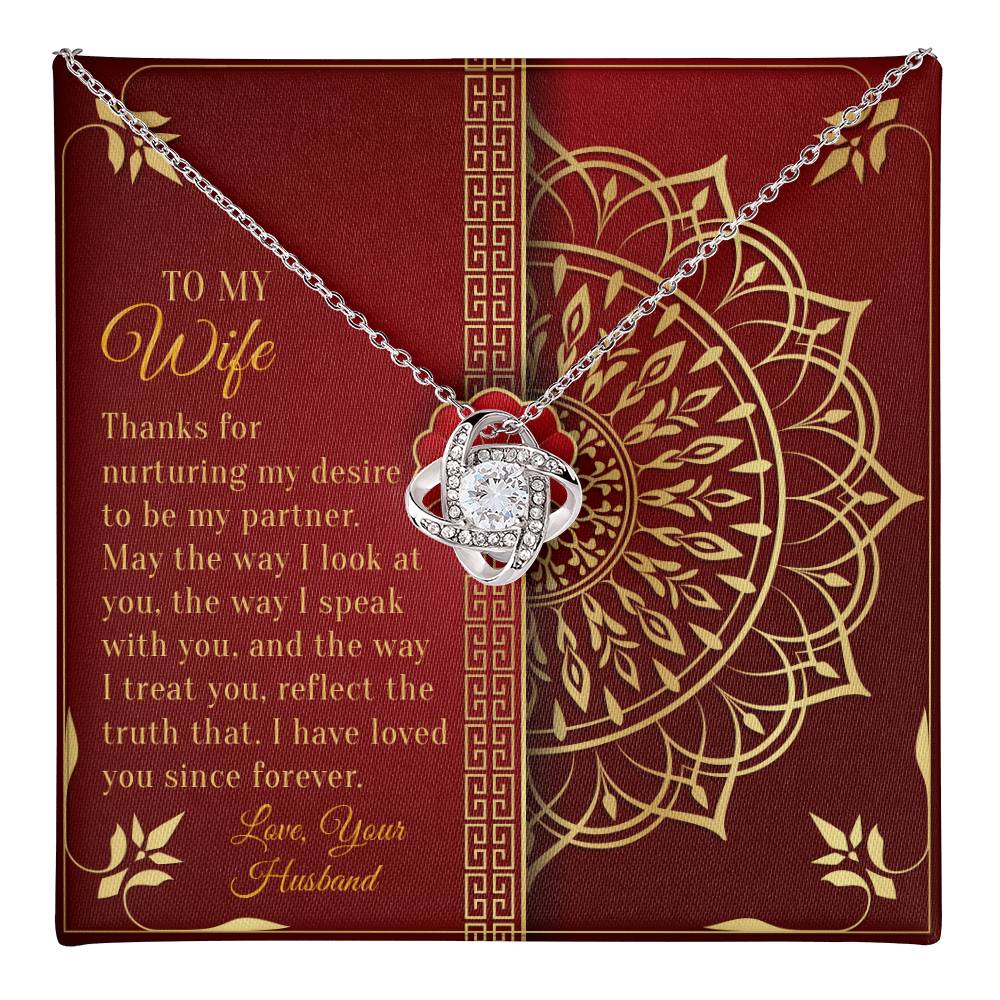 Celebrate the bond of eternal love with this elegant love knot necklace, perfectly paired with a red mandala message card that speaks from the heart. The message reads:
